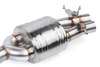 The factory exhaust tips are integrated into the rear bumper valance. APR retains this layout and places the exhaust outlets within, making the system compatible with factory and aftermarket tips.